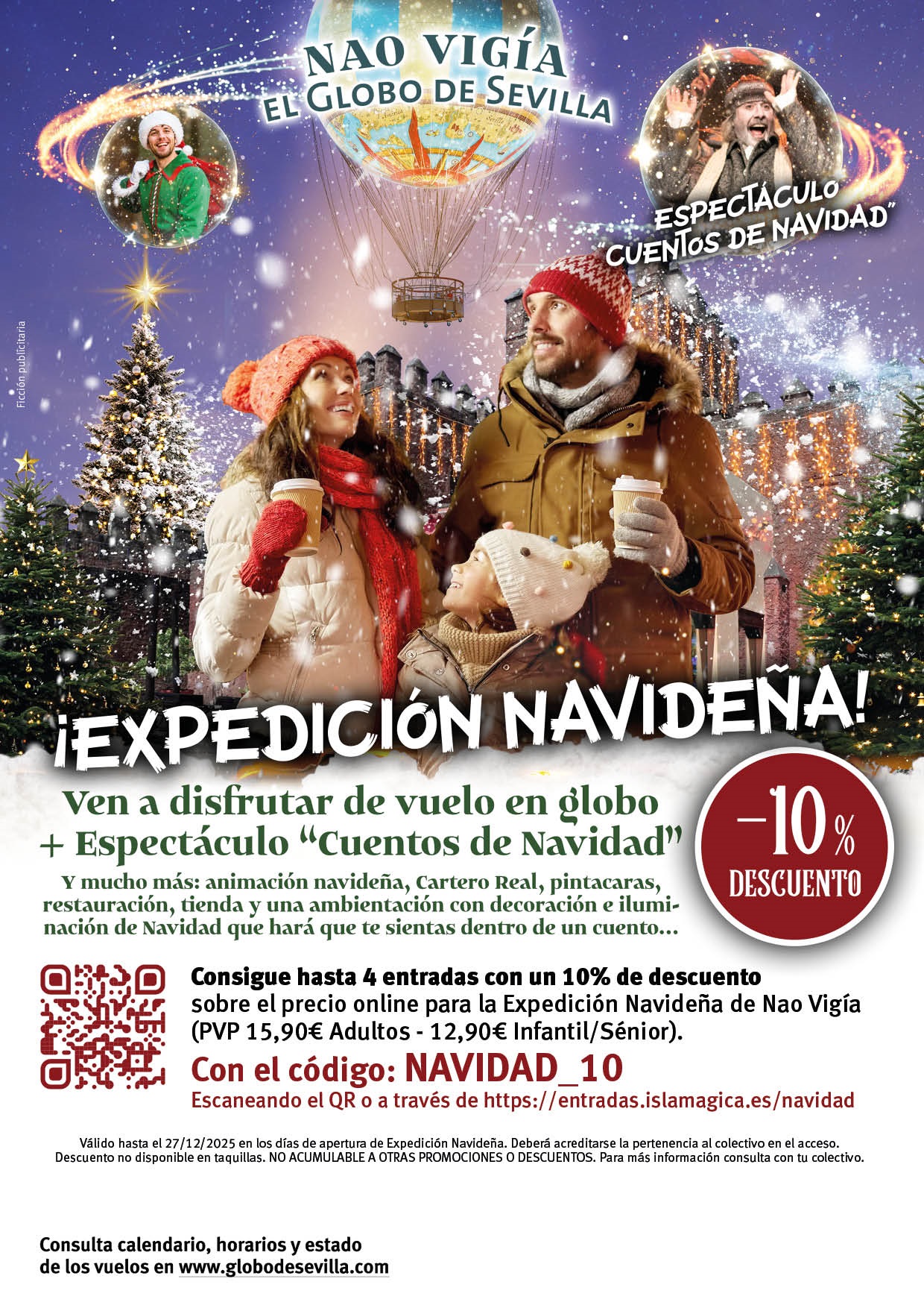 En la expedición se podrá disfrutar de vuelo en globo + Espectáculo “Cuentos de Navidad”, y mucho más: animación navideña, Cartero Real, pintacaras, restauración, tienda y una decoración muy navideña y…¡¡¡NIEVE en Sevilla!!!! Sentirás que estás dentro de un cuento de Navidad.